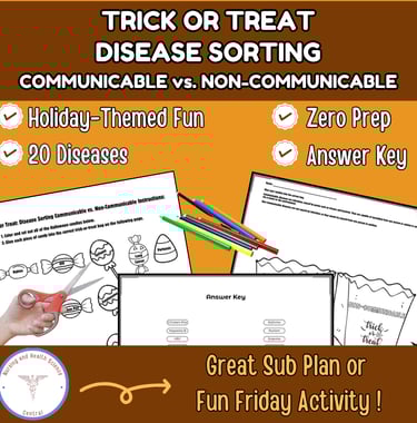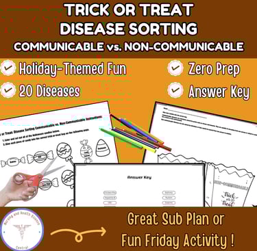 The Halloween Health Science Communicable & Non-Communicable Disease Sorting Activity turns review into an active, tactile learning experience. It’s perfect for group rotations or fast finishers.