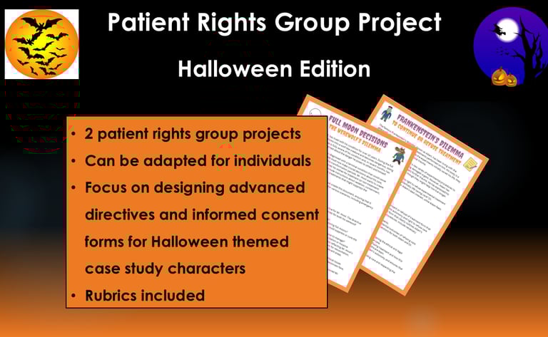 Ethical reasoning can feel abstract—until you make it tangible. The Patient Rights Group Projects: Nursing & Health Science Halloween Edition (also available on AUL) has students work through realistic case studies in a Halloween theme, turning discussion into discovery.